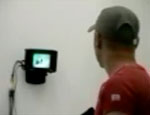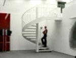 Während er sich mit dem Raum dreht fällt ein unfixierter Sessel mit lautem Poltern umher.