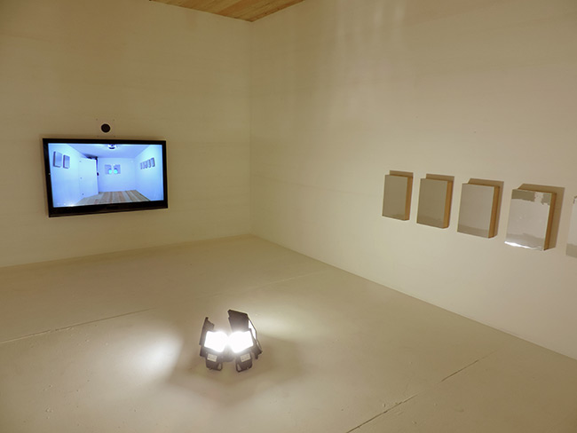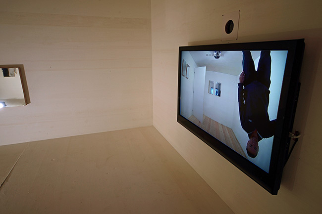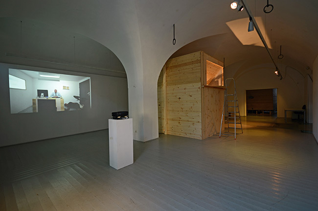 Zwei Raum im Raum Installationen mit den Titeln "White Cube Attrappe" und "Besuch beim Bankberater".