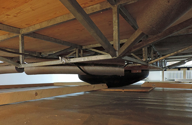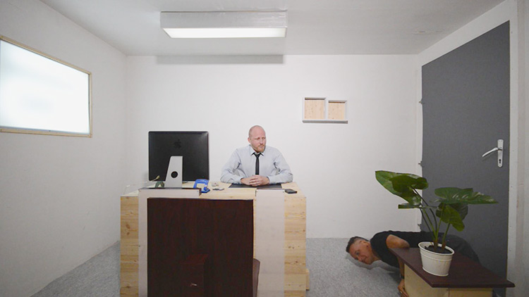 Der zweite, der gekippte Raum, wird, um 90 Grad gedreht, hochkant stehen, d.h. das Mobiliar hängt an einer Seitenwand. Das Interieur, ein Schreibtisch und zwei Stühle verweist auf eine Bürosituation. Hinter dem Schreibtisch sitzt, angeschnallt in 3 Metern Höhe, ein "Angestellter". Der Performer klettert zu ihm hoch. Nach kurzer Begrüßung bietet ihm der Herr im Anzug ein Getränk an, anschließend unterschreibt der Performer ein Schriftstück und lässt sich schließlich rückwärts in die "Tiefe" fallen. Die Aktion kann vom Publikum über eine am Boden montierte Kamera live als Projektion mitverfolgt werden.