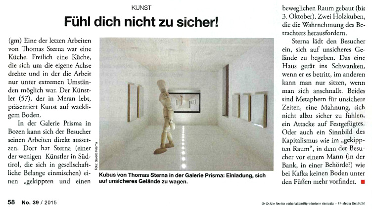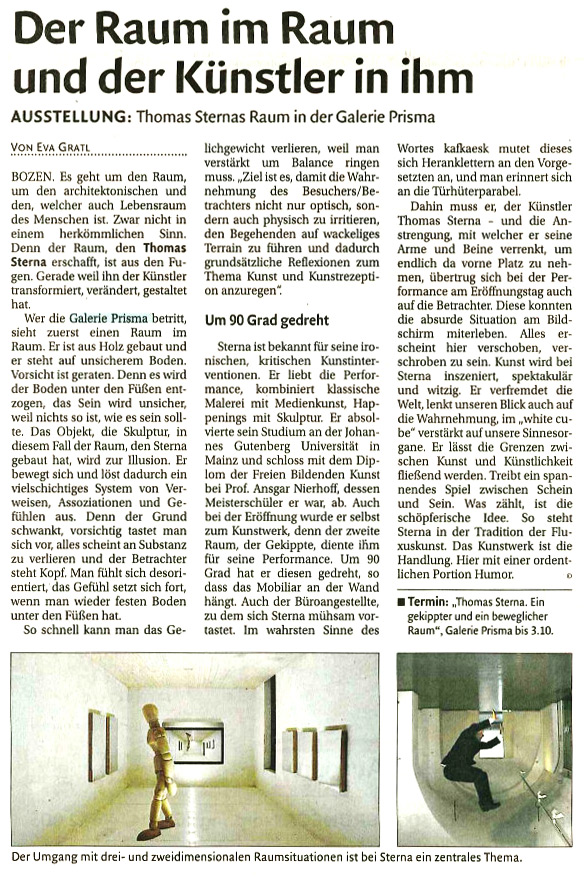 Der in Meran lebende Künstler Thomas Sterna präsentiert in der Galerie Prisma eigens für den Ort konzipierte Raum im Raum Installationen. Der Umgang mit drei- und zweidimensionalen Raumsituationen ist in den letzten Jahren bei Thomas Sterna zum zentralen Thema geworden und zweigt sich in interaktiven Objekten, Foto- und Videodokumentationen sowie waghalsigen Performances, die Alltagssituationen auf verzerrte, auf den Kopf gestellte, reduzierte oder gar entblößte Art und Weise vorführen.
