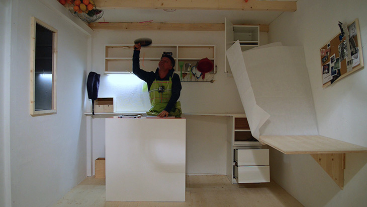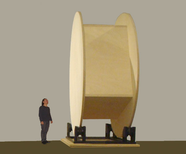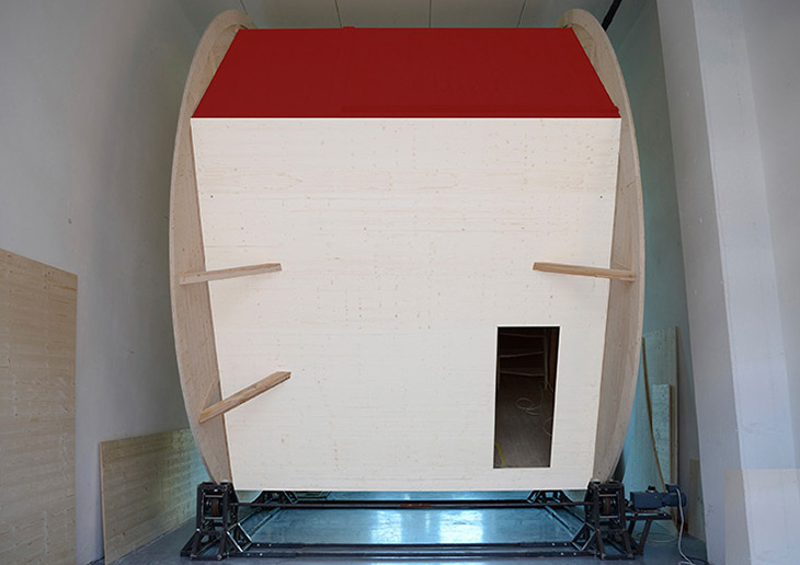 Eine Halle neben einer Autowerkstatt und einem Brachgelände an der MeBo-Ausfahrt in Meran Untermais. Hier baut der in Aschaffenburg geborene, seit 10 Jahren in Südtirol aktive Künstler Thomas Sterna seit Dezember 2012 an einer rätselhaften Konstruktion: Eine riesige "Kiste" von 4 Metern Breite, eingefasst in Holzräder von 6,5 Metern Durchmesser. Im Inneren des kubischen Mittelteils befindet sich ein Raum, der sich durch die komplexe mechanische Lagerung der Räder vollständig um seine eigene Achse drehen lässt - und in diesem Raum eine vollständig eingerichtete kleine Küche.