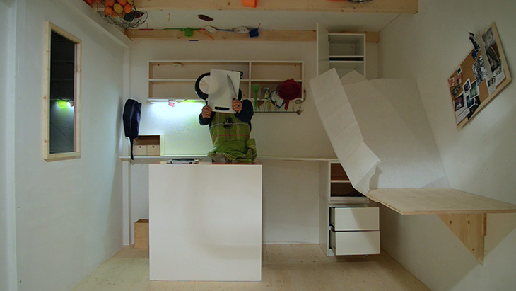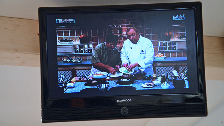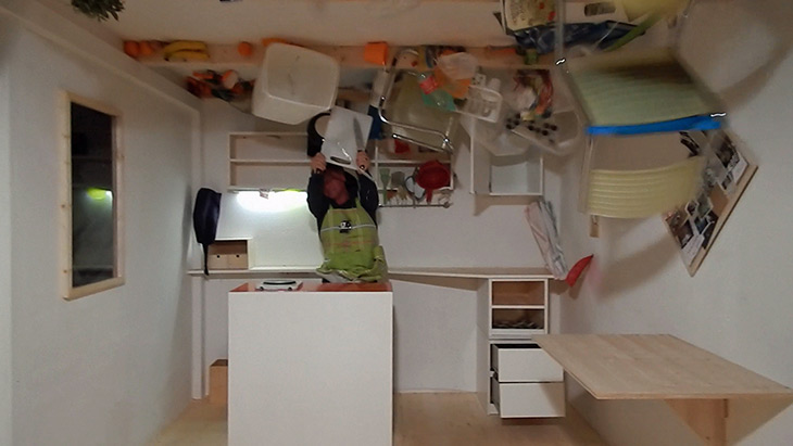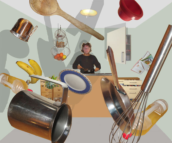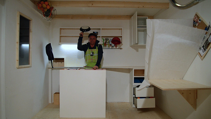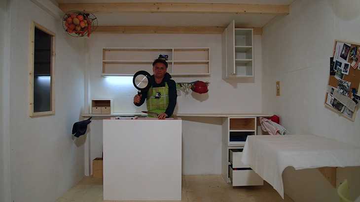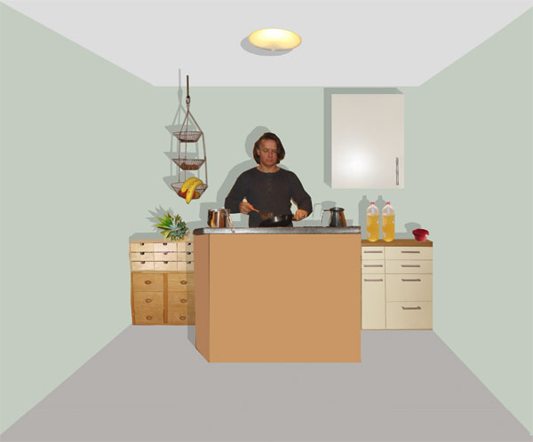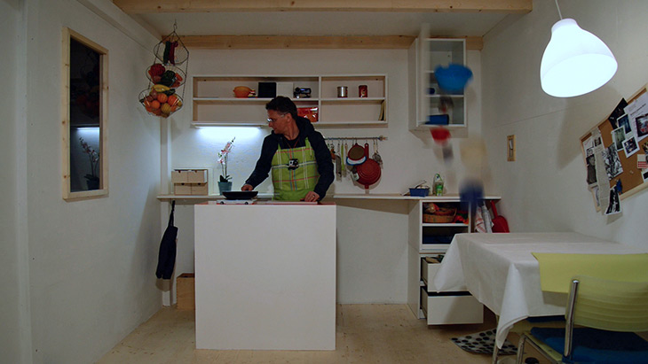 In einem Raum, der sich um seine eigene Achse dreht, wird eine kleine Küche installiert. Die Schränke hinter dem Koch werden mit Töpfen, Geschirr und den sonst üblichen Haushaltsgeräten bestückt. Dazu gibt es eine Kochplatteund einen kleinen, mit Lebensmitteln gefüllten Kühlschrank. Die Schränke sind fix installiert, Türen und Schubladen aber offen. Gegenüber der Küchenzeile befindet sich an der Stirnseite ein fest installierter kleiner Fernseher auf dem eine Kochsendung läuft.