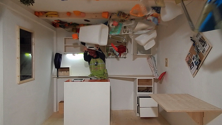 Eine Situation die mit dem Raum ins Kippen kommt. Während manche Möbel im Raum fest installiert sind, sind ihre Türen und Schubladen aber offen, so wird ein scheinbar einfacher Vorgang, wie das Braten eines Steaks, zum Kampf mit der sich im Verhältnis zum Raum laufend verändernden Schwerkraft. Ein klares Bezugssystem von oben und unten scheint es nicht mehr zu geben. Das Chaos nimmt seinen Lauf. Der geschlossene Raum ist nicht einsehbar, das Publikum ist aber Zeuge dieser Drehungen der Skulptur und verfolgt das Geschehen via Liveprojektion aus ihrem Inneren, dokumentiert und aufgezeichnet über mehrere im Raum und eine weitere, an der Brust des Künstlers installierte Kameras. Deutlich hörbar sind jedoch die Bewegungen der im Raum auf den Künstler einstürzenden Einrichtungsgegenstände...