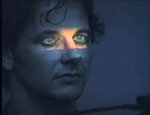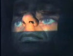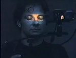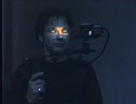 1996 Thomas Sterna trägt auf einem Schulterstativ einen Videoprojektor vor dem Gesicht. Dieser projiziert die Aufnahme umherschauender Augen auf seine geschlossenen Augenlieder.