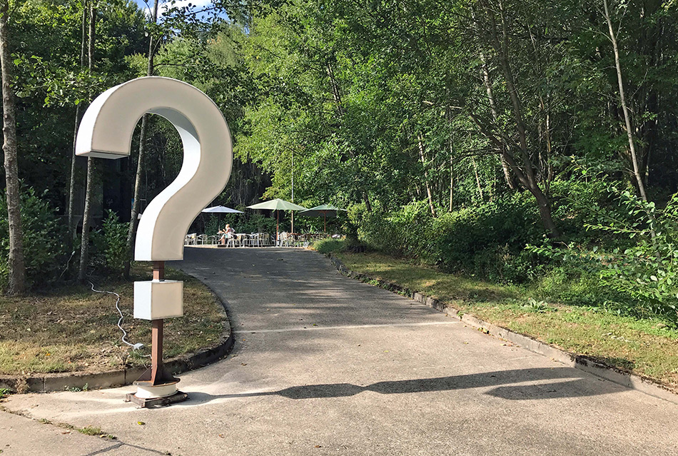 Großes Fragezeichen, 2018, Maße: 320 x 160 x 30 cm, Material: Holz, PVC, Stahlgestell, Drehmotor, LED Licht