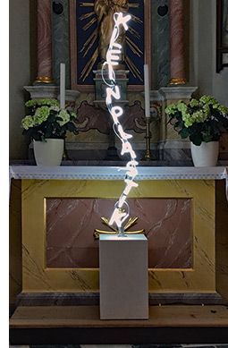 Das Werk „?“ kann als Statement zur Urfrage des Menschen „Woher kommen wir? Wer sind wir? Wohin gehen wir? interpretiert werden. Ein Aufruf also, über die wahren Zusammenhänge des eigenen Lebens zu reflektieren und so neue Erkenntnisse zu gewinnen. Auf dem Altar der St. Anna Kirche stehend, fragt auch die neon-Arbeit „Kleinplastik“ wie denn religiöse Skulpturen des 21. Jahrhunderts aussehen könnten. Das Werk verweist auf das Formenvokabular klassischer Skulpturen oder auf jenes der gotischen Mariendarstellungen, in denen die stehende Muttergottes das Jesuskind auf ihrer Hüfte abstützt. Diese Platzhalterskulptur eröffnet dem Betrachter die Möglichkeit, eine eigene Figur im Kopf zu entwerfen und die bereits vorhandenen in einem neuen Licht zu sehen. (Brigitte Matthias / Adina Guarneri)