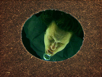 Das Gesicht des Künstlers taucht langsam aus dem Wasser auf und verschwindet wieder. Dazu ist ein Blubbergeräusch zu hören.
