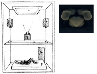 Der Besucher betritt einen abgedunkelten Raum und kann sich auf eine Holzpritsche legen. Im Liegen sieht er an der Decke des Raumes die Projektion von Körpern, die sich auf einer Glasplatte bewegen. Durch die digitalen Spiegelungen und Veränderungen der Aufnahmen erscheinen diese zunächst sehr abstrakt und werden erst aufden zweiten Blick als Abbildungen von Körpern erkennbar.