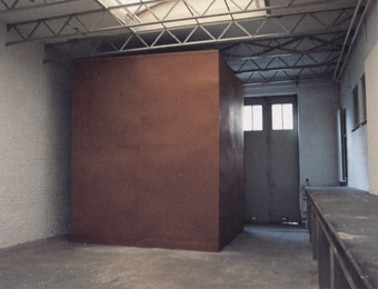 1 Videorekorder, 1 Verstärker, 1 VHS-Videoband (Looplänge: 15 Min.), 2 Lautsprecher, 1 Videoprojektor, 1 Glasscheibe (180 x 240 cm) mit Stahlrahmen und Rückprojektionsfolie, 1 Holzpritsche (180 x 240 cm, Höhec: 30 cm), Balkenkonstruktion aus Hartfaserplatten (350 x 350 x 500 cm), 1 Spiegel (110 x 150 cm). |