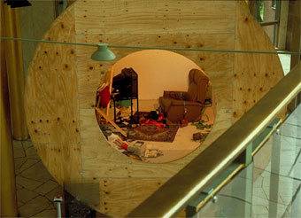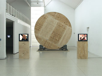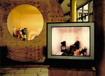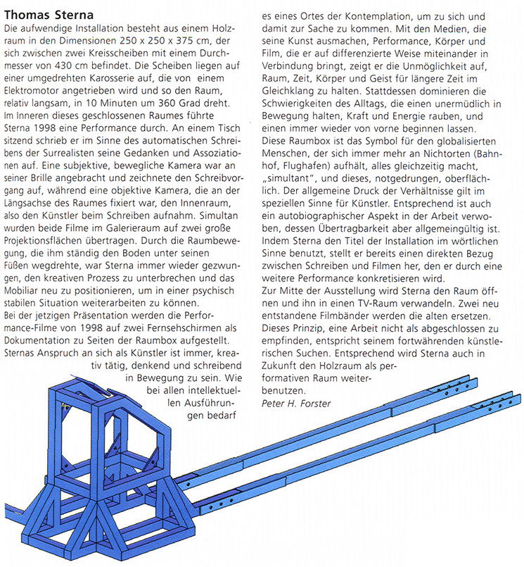 Eine geschlossene Raumbox ist zwischen 2 Holzrädern (Durchmesser: 430cm) montiert. In dieser Box sitzt der Künstler festgeschnallt an seinem Sessel und klickt sich durch die Fernsehkanäle des laufenden Abendprogramms. Der Fernseher ist ebenso fest mit dem Boden verbunden, wie er selbst und eine den ganzen Raum zeigende Funkkamera. Der Raum dreht sich langsam, so daß die Decke zum Boden wird und der Boden zur Decke. Das nicht fixierte, mit Büchern, Zeitschriften und anderen persönlichen Gegenständen gefüllte Ikea-Regal macht sich selbständig und bedroht schließlich, in seine Einzelteile zerlegt, den stur weiter zappenden Performer.